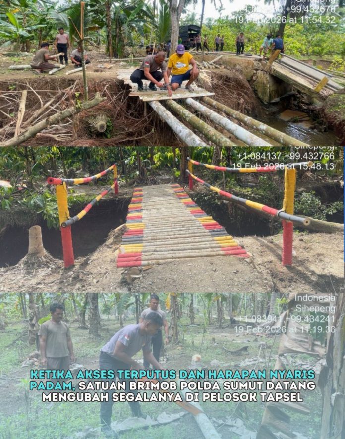 Tapanuli Selatan, LINI NEWS – Satuan Brimob Polda Sumatera Utara membangun jembatan darurat di Desa Somanggal Parmonangan, Kecamatan Sayur Matinggi, Kabupaten Tapanuli Selatan, menyusul rusaknya jembatan penghubung yang sempat memutus akses warga antarwilayah.