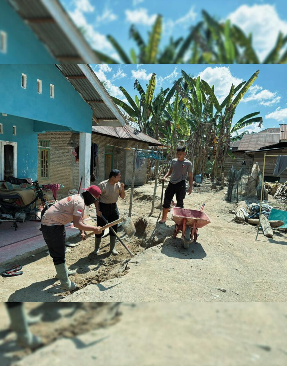 Selain memastikan situasi tetap aman dan kondusif, personel Brimob turut membantu pengecetan Huntara di Desa Garoga, mengoperasikan dapur lapangan, serta meratakan tanah di depan rumah warga atas nama Bapak Marancar Simatupang, sebagai wujud nyata kepedulian terhadap pemulihan lingkungan dan kenyamanan masyarakat.