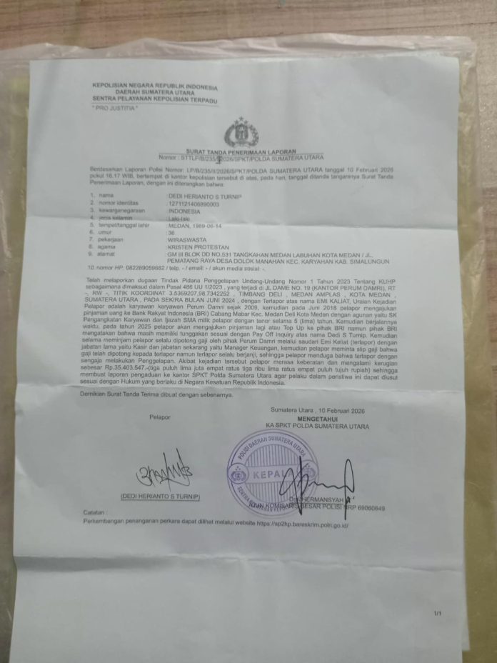 Merasa dipermainkan dan dirugikan secara administratif maupun moral, Dedi menyatakan melaporkan kasus ini ke Polda Sumatera Utara, terkait dugaan penggelapan pembayaran pinjaman yang telah dilunasi melalui potongan gaji resmi Nomor STTLP/B/235/II/2026/SPKT/POLDA SUMATERA UTARA yang ditanda tangani KA SPKT POLDA SUMATERA UTARA AKP Drs Hermansyah 10 Pebruari 2026